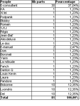 Demain, je vous d�voile la constitution d�finitive du capital. On se croirait � la Star Ac'. Il manque plus que l'hussier et son enveloppe cachet�e.