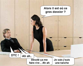 Depuis quelques temps, j'ai un gros soucis, un truc qui me tracasse vraiment, une couille dans le potage qu'est ma vie de cadre bien sage, �a devient limite une n�vrose alors que je commence � �tre en rade de Xanax, bref, je commence � �tre r�ellement dans une fucking shit et j'aimerais que tu m'aides avec tes nombreux conseils : Y a une pute au bural qui me files grave la gaule, et j'ai une m�chante envie de la p�cho.