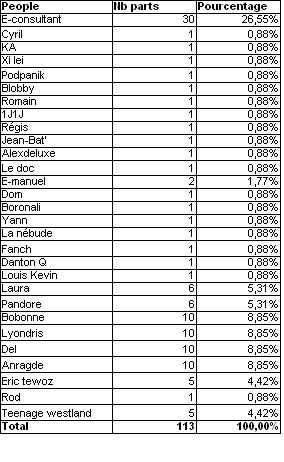 Demain, je vous d�voile la constitution d�finitive du capital. On se croirait � la Star Ac'. Il manque plus que l'hussier et son enveloppe cachet�e.