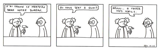 C'est l'occas' r�v�e pour se cogner d'une traite les 100 strips super sympas et super fendards de Ma vie au boulot. Ca devrait bien te prendre la matin�e �a. Apr�s, tu fais tourner � tous tes potes, parce que le gars il se d�chire sur ses b�d�s, et il m�rite bien que tu fasses un peu tourner son blog.