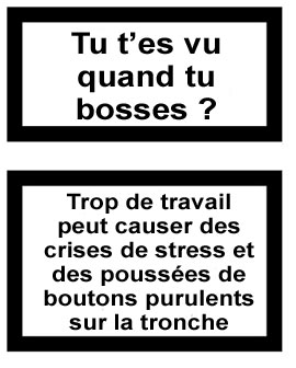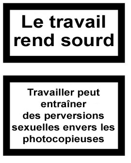 Le principe de cette op�ration sticker de grande envergure est d'imprimer les �tiquettes que je vous refile en dessous sur une page de papier auto-collant et d'aller coller �a partout o� �a vous chante dans votre entreprise. La machine � kawa certes, mais aussi les booklets � envoyer au clibard, les fiches de salaires, le menu de la cantoche, les m�mos de la sous-dirlo, le rouleau de PQ. Ou encore : sur les dossiers qui tra�nent ou les boutons de l'ascensceur, au beau milieu de l'�cran de Jean-Michel du service compta ou sur le tailleur crois� de Jacqueline la pouf du 3�me, sur les pompes de Patrick pendant sa sieste de 15H25 ou sur la tronche du nouveau stagiaire. Bref, partout o� ca peut se voir un minimum.
